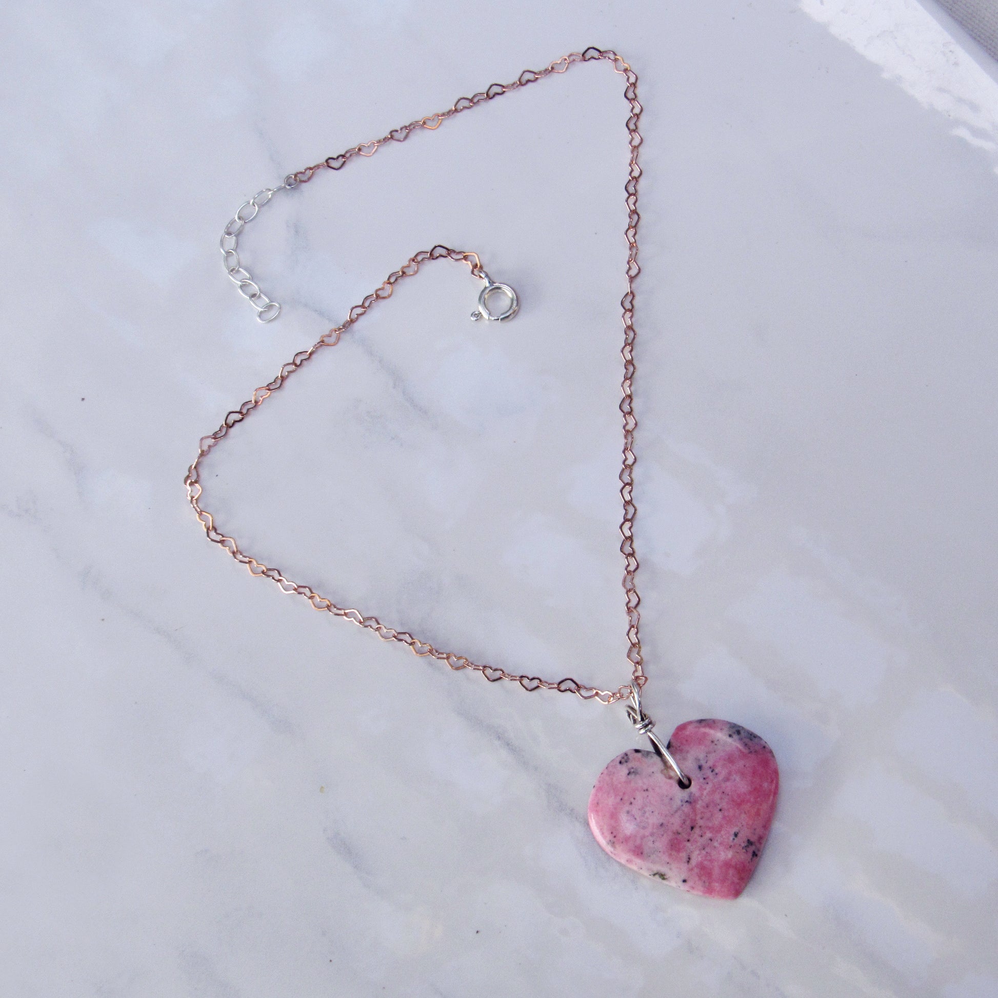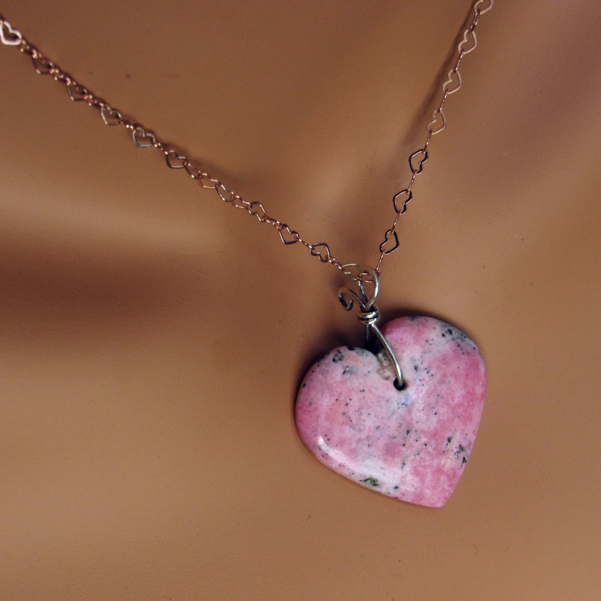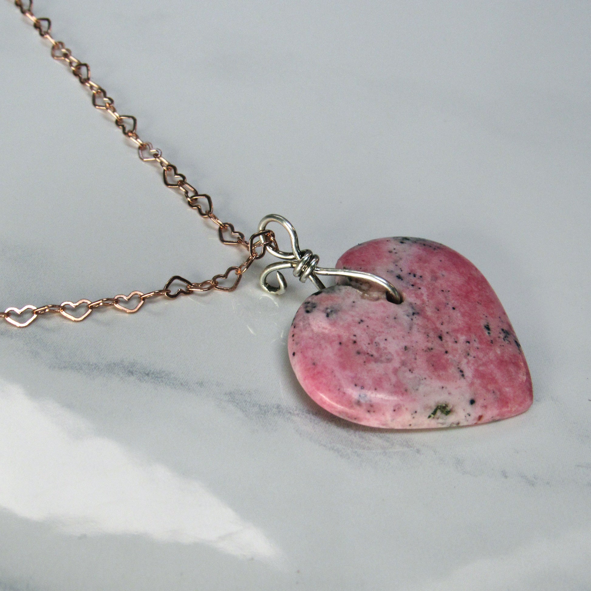 Rhodonite Heart w/ Hand Wrapped Sterling Silver, Rose Gold Fill over Sterling Silver Heart Chain