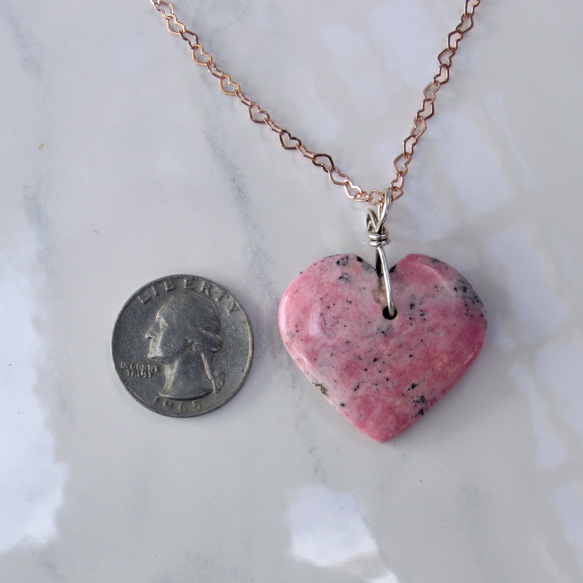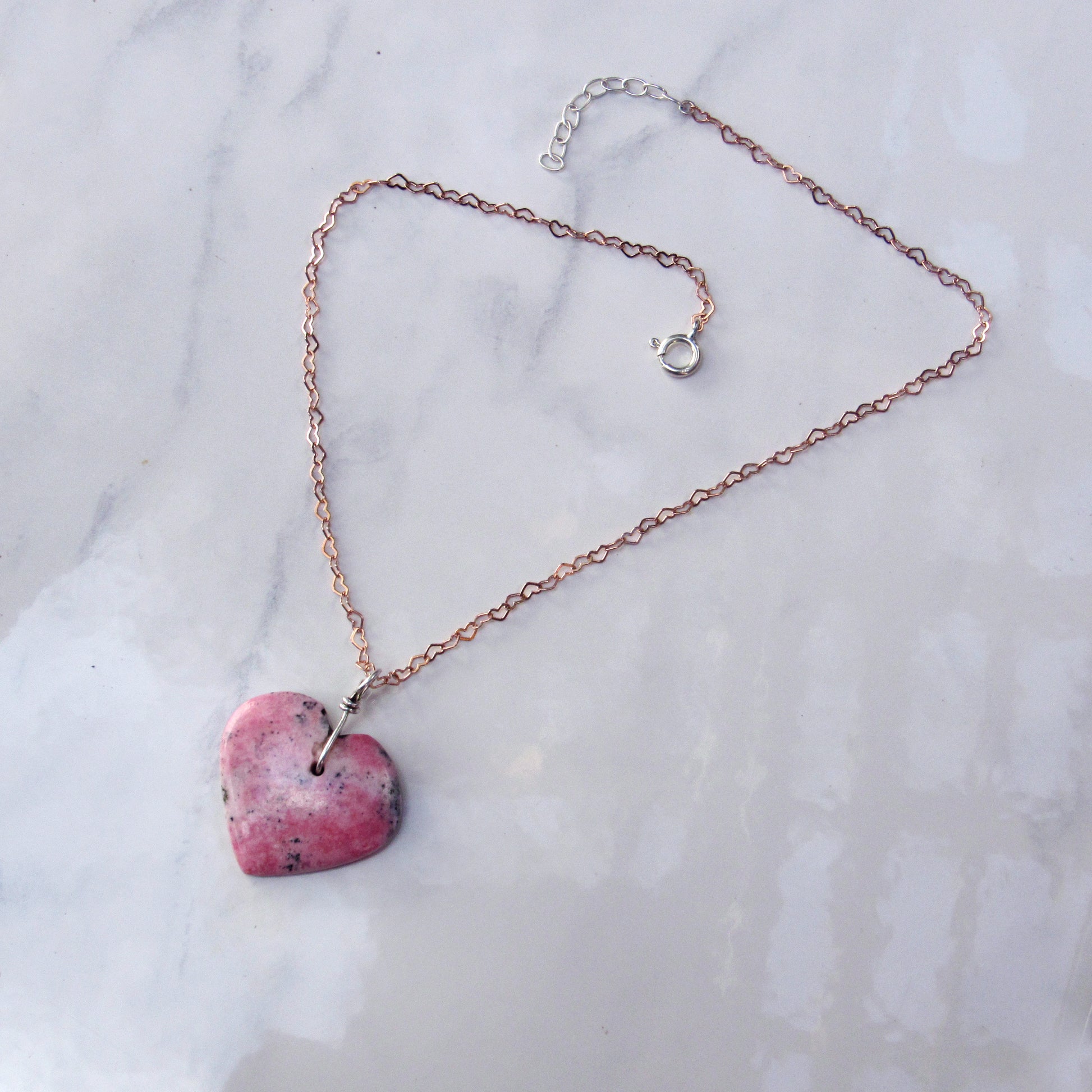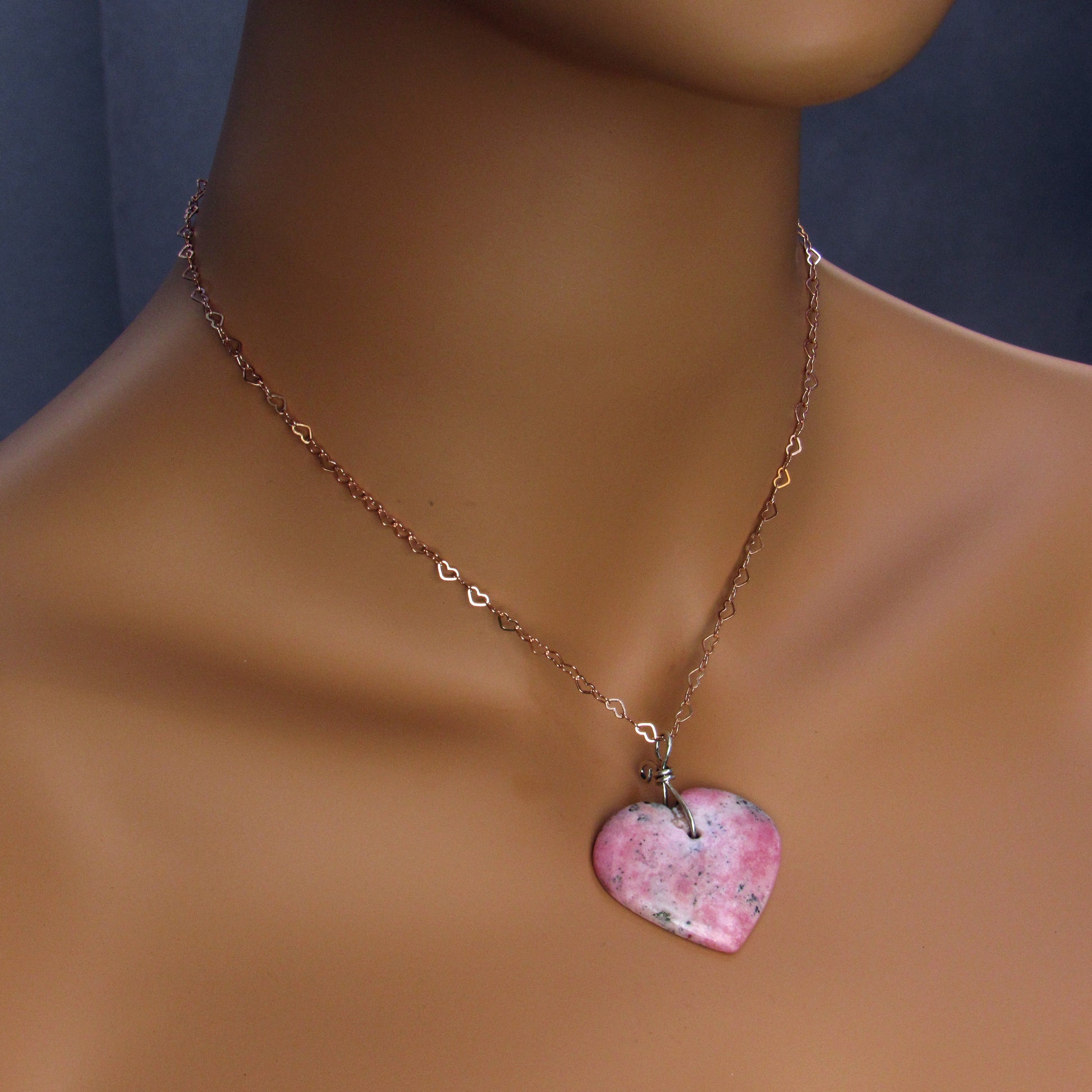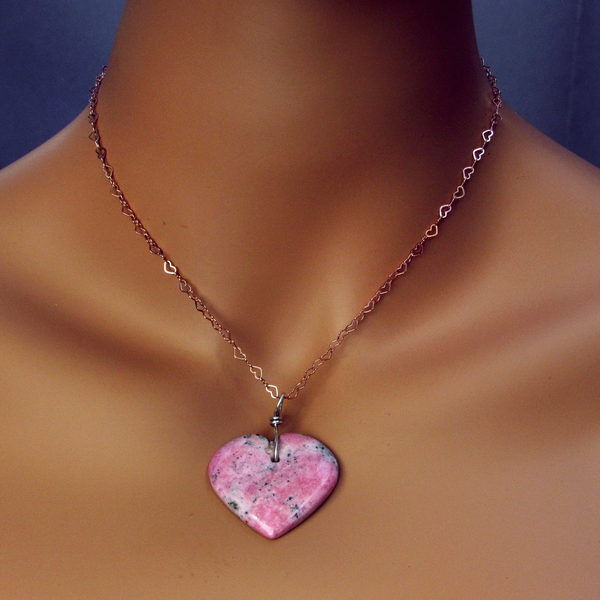 Rhodonite Heart w/ Hand Wrapped Sterling Silver, Rose Gold Fill over Sterling Silver Heart Chain
