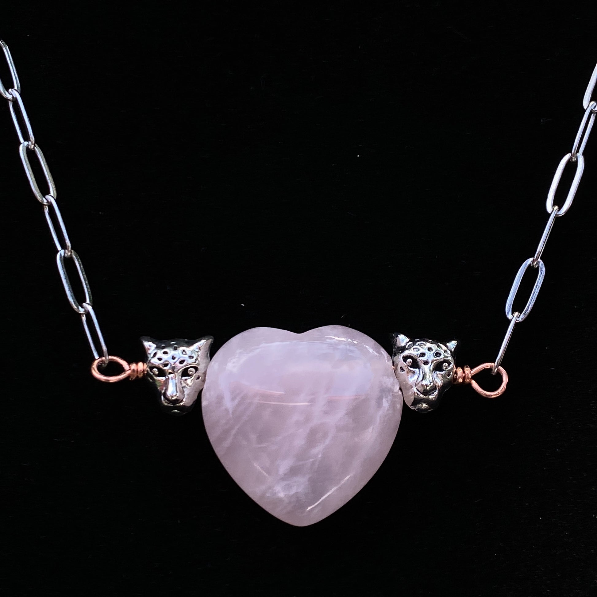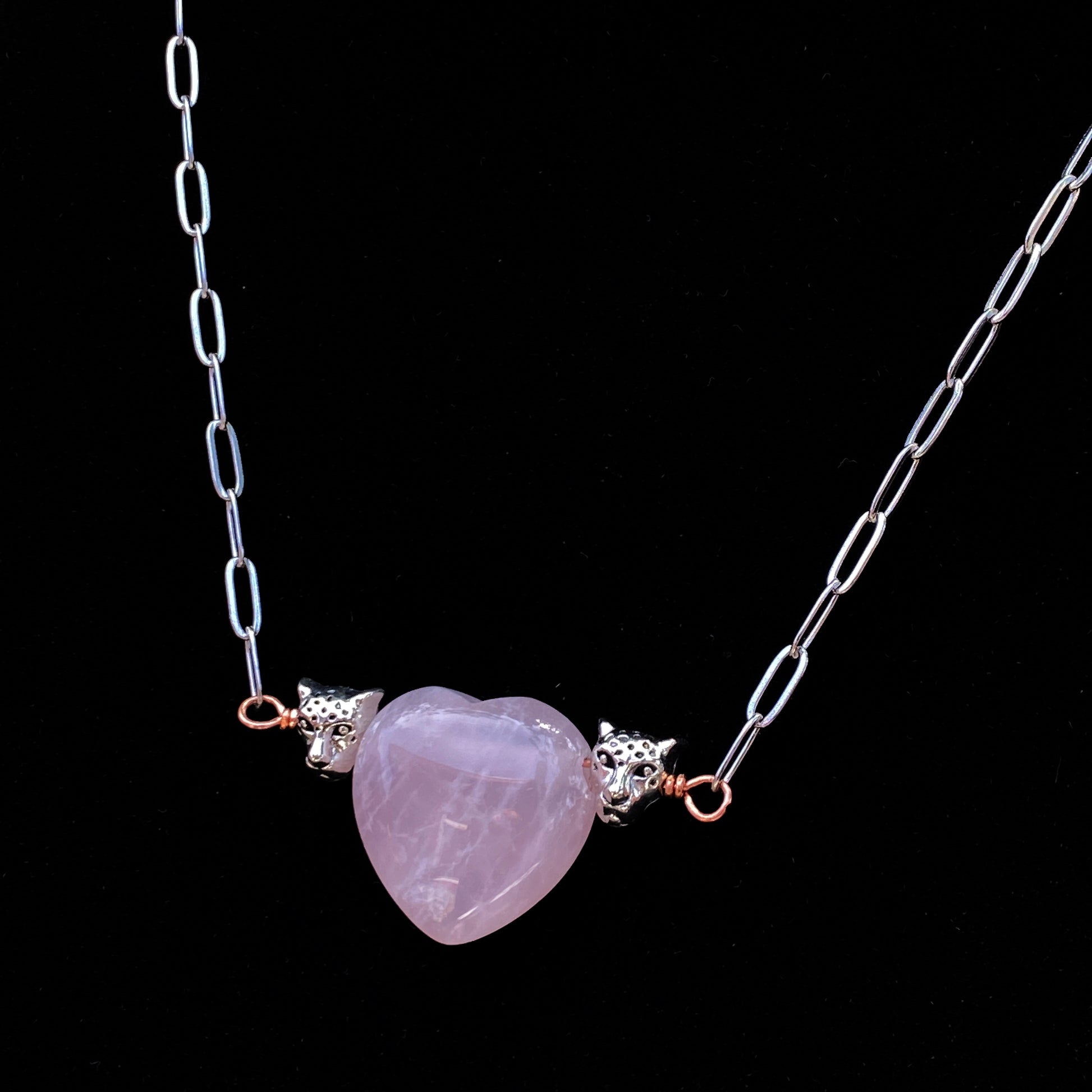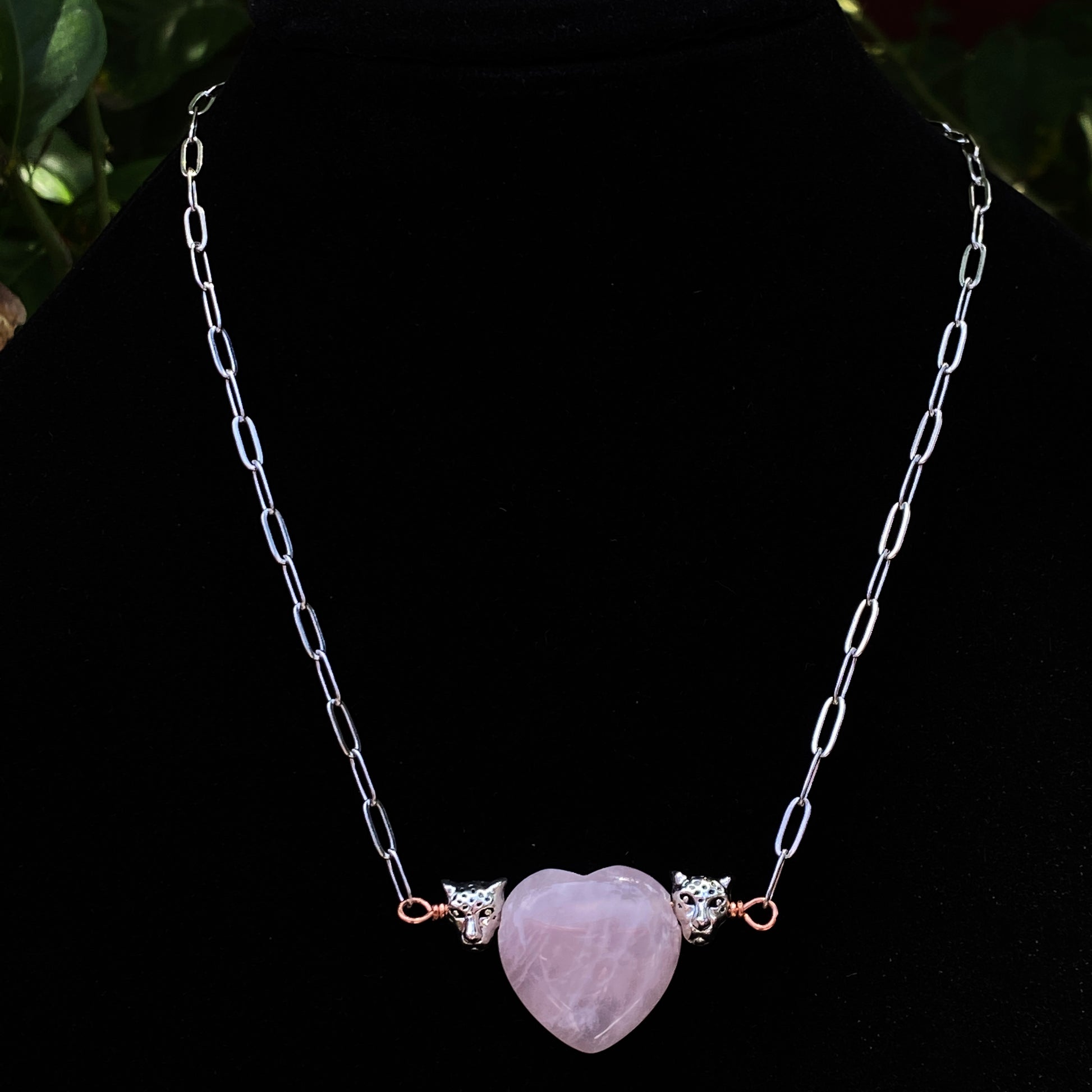 Rose Quartz gemstone Heart and Leopard head Necklace
