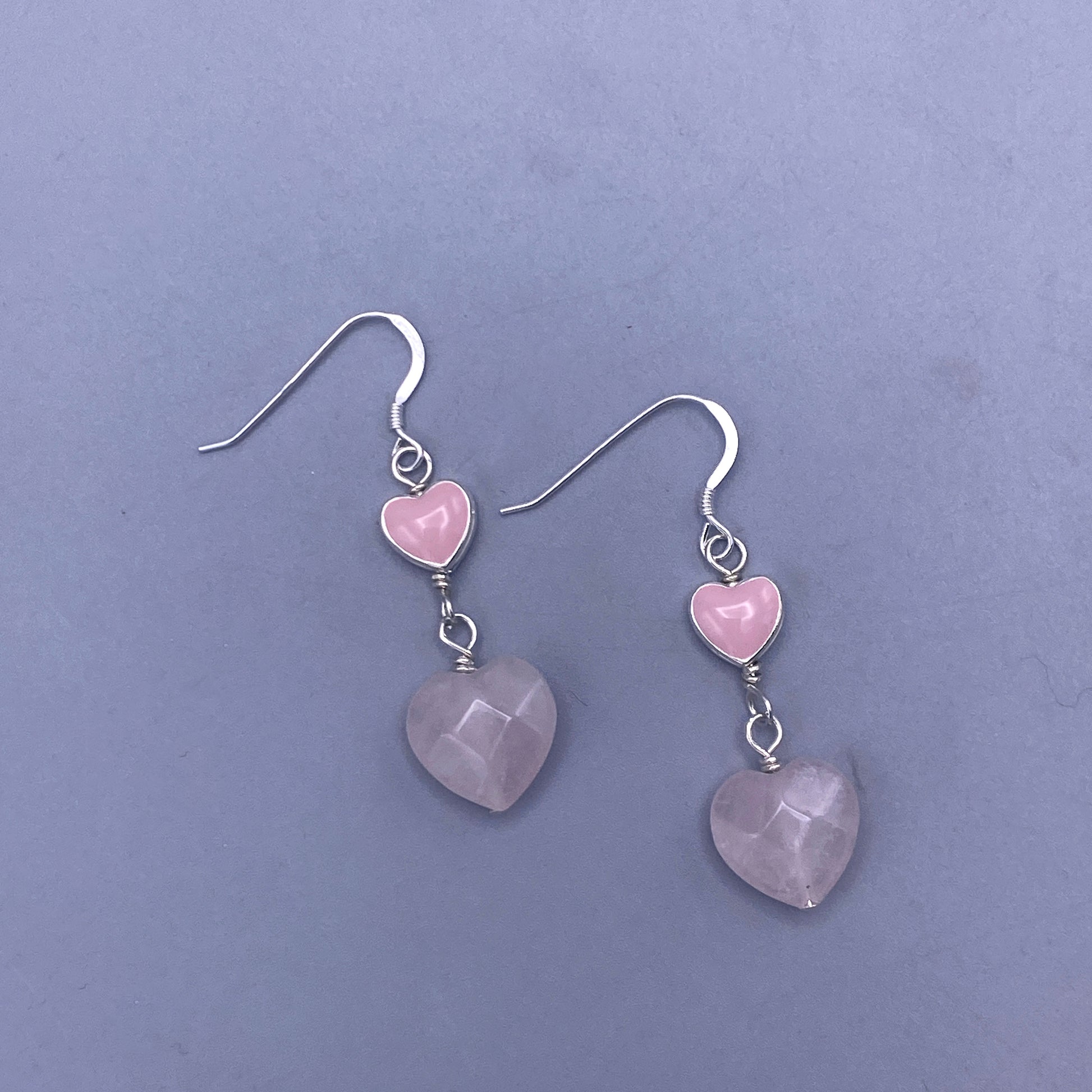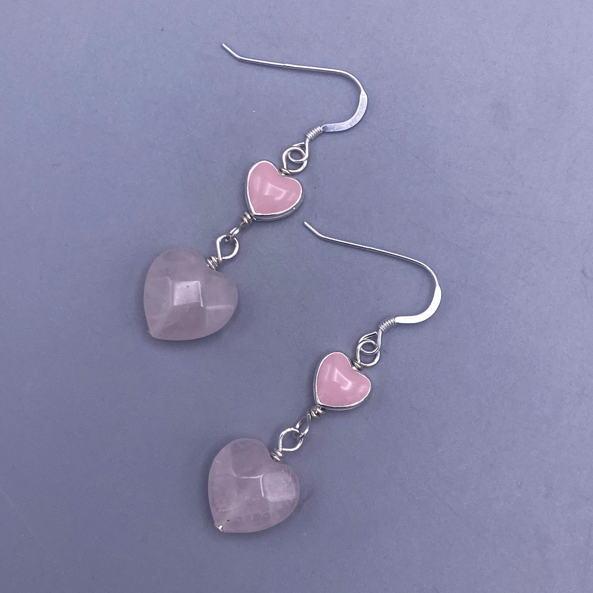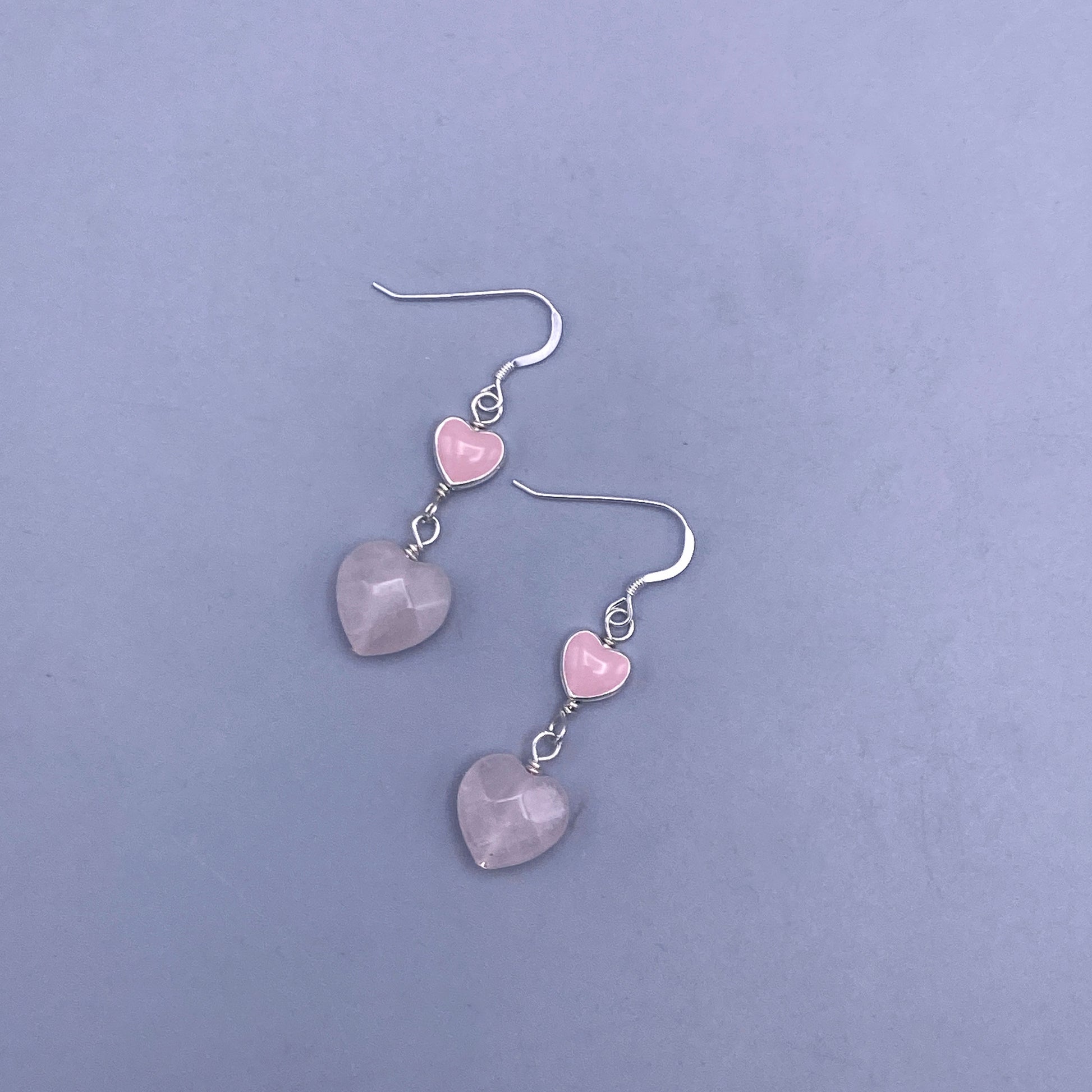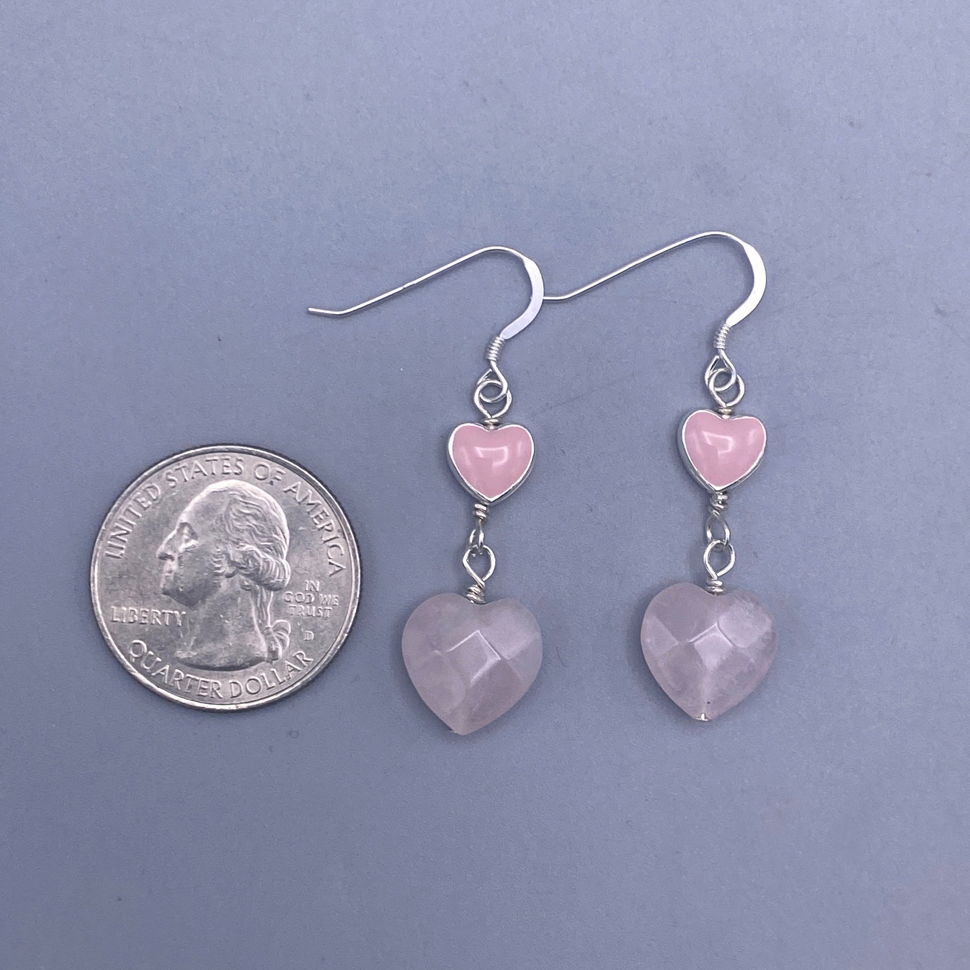 These dangle earrings feature a genuine rose quartz gemstone shaped into a heart, made with sterling silver.