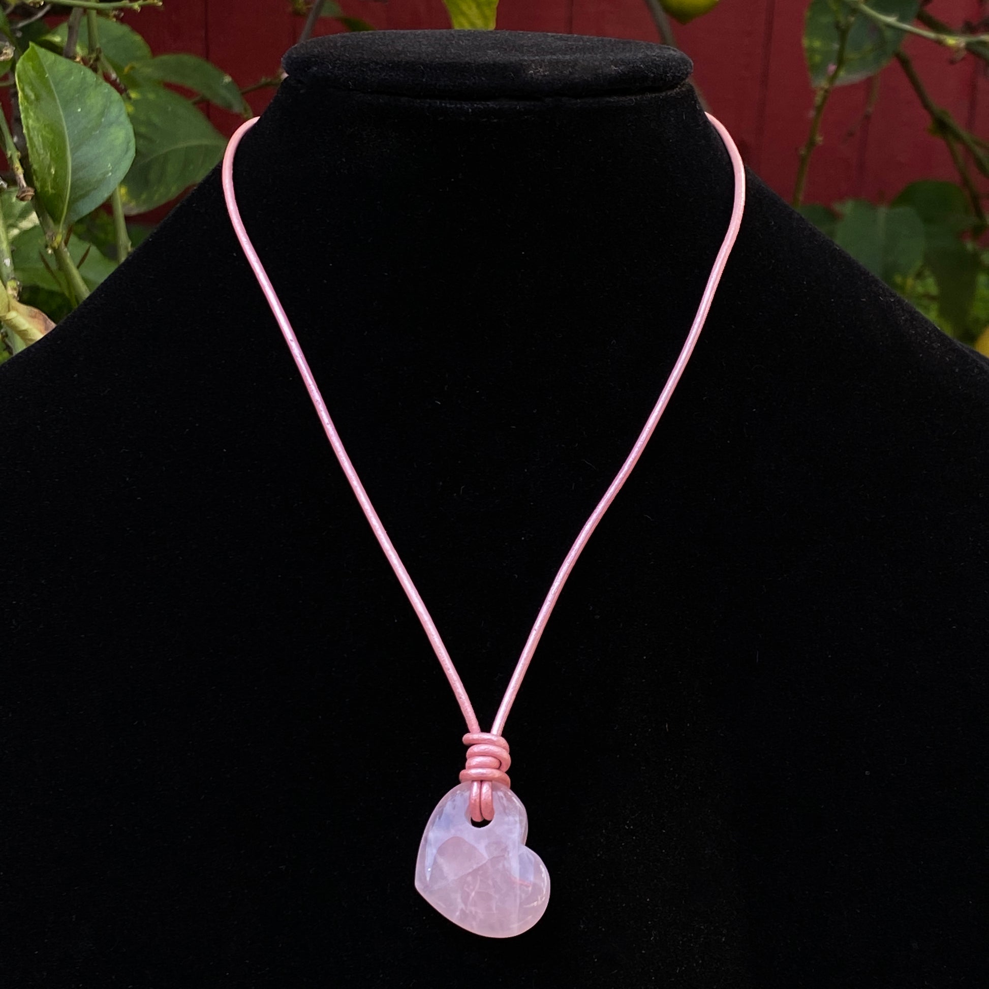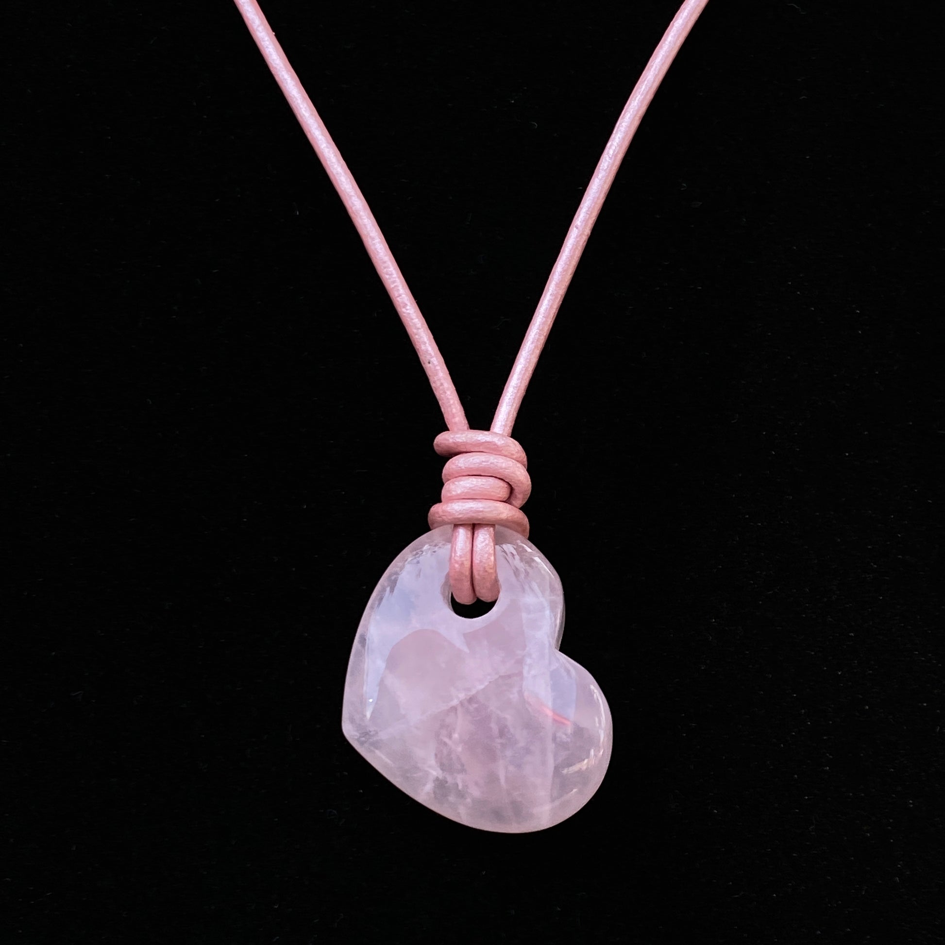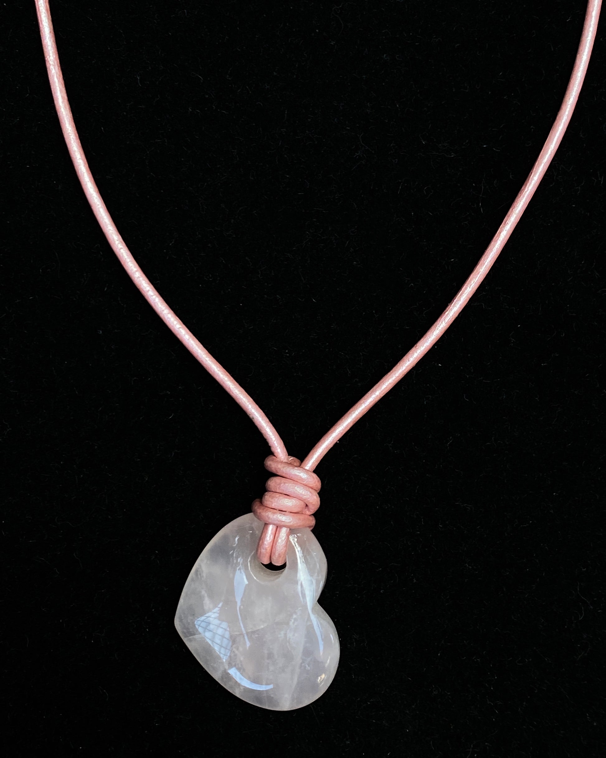 Genuine Rose Quartz heart on genuine leather.