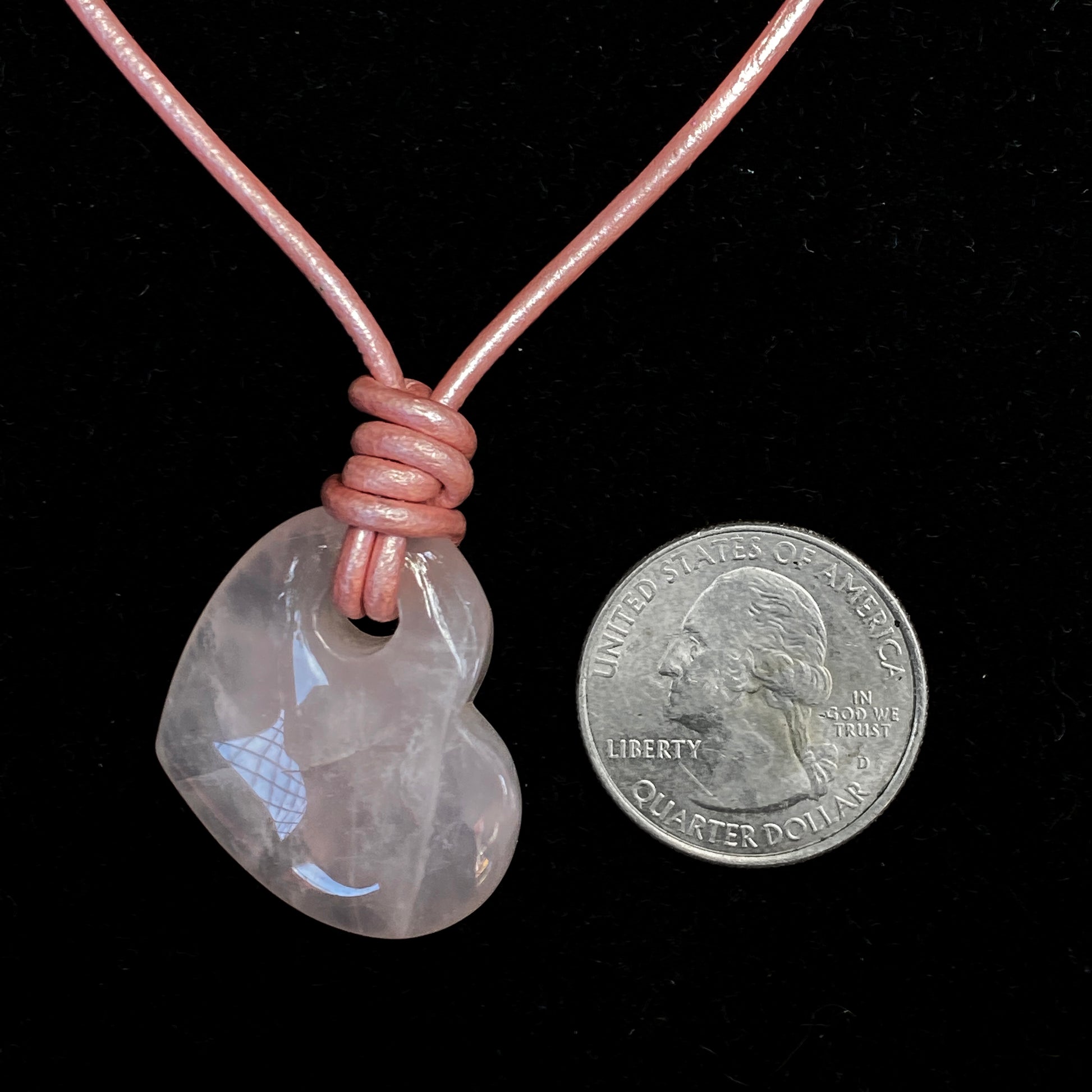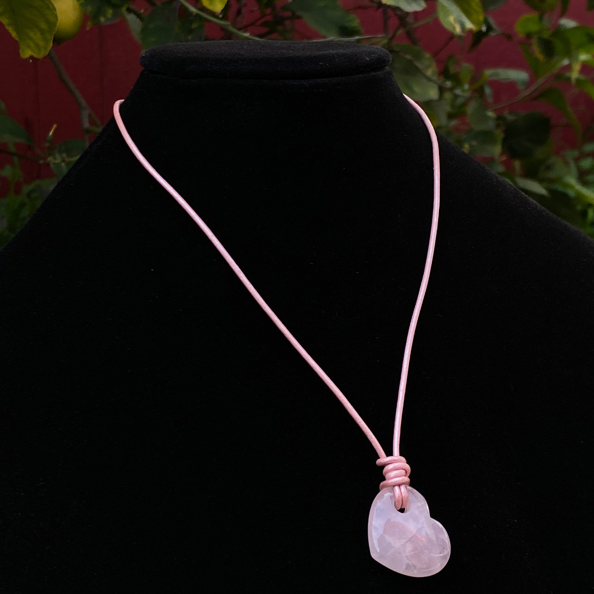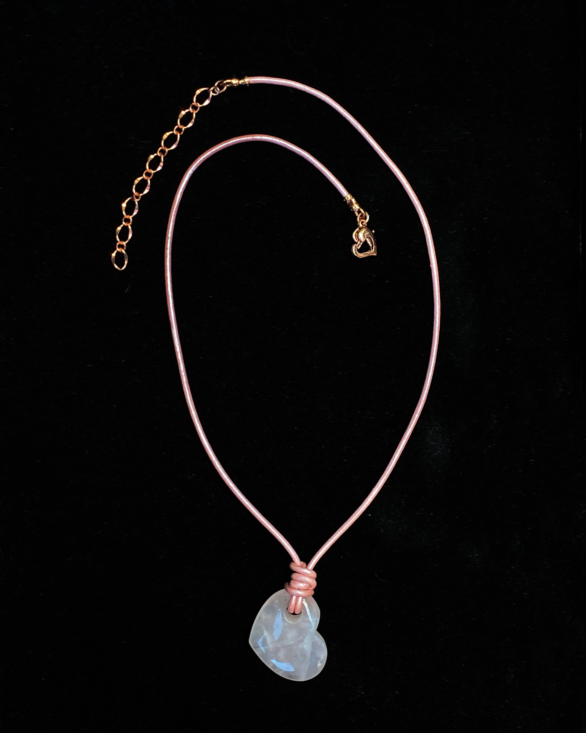 Genuine Rose Quartz heart on genuine leather.