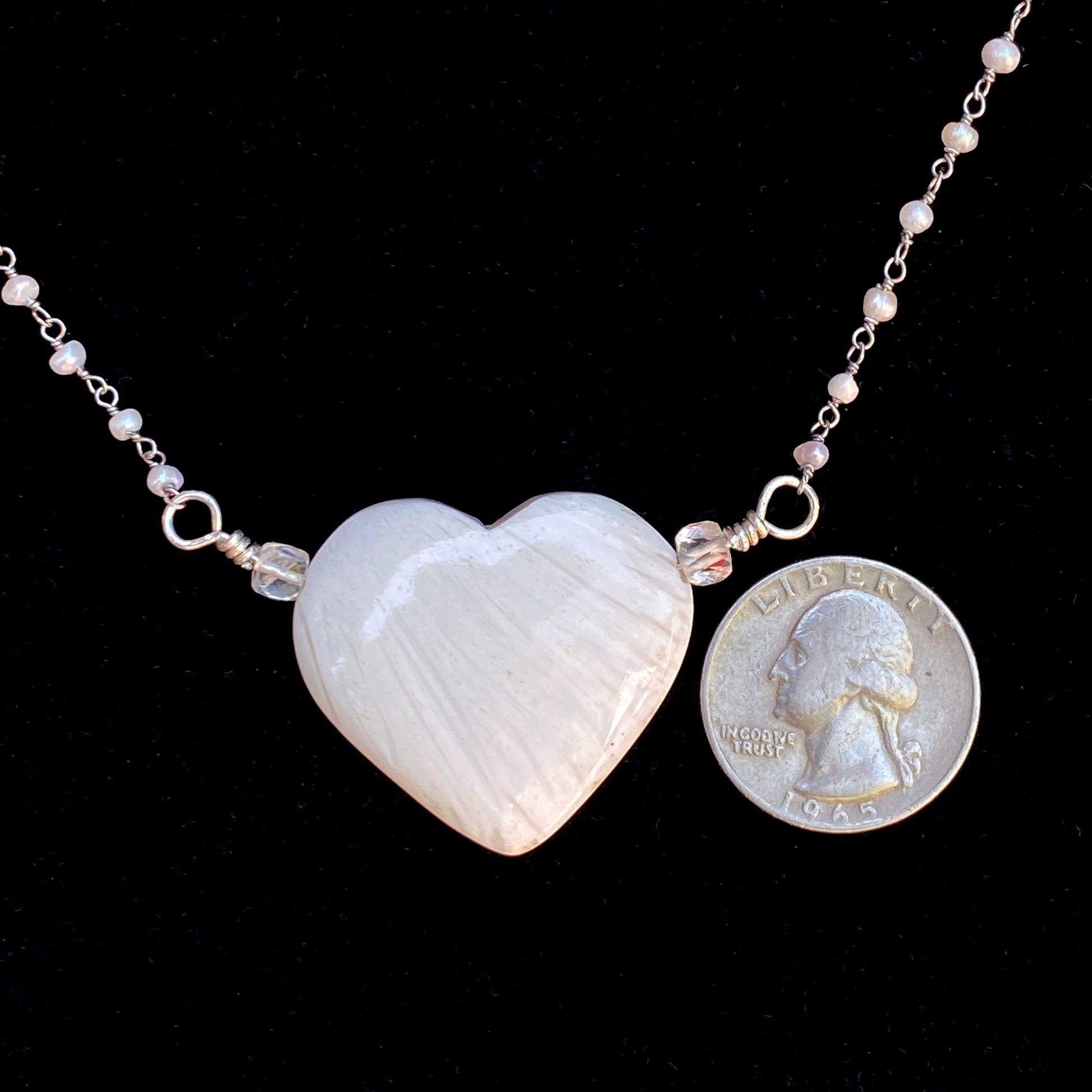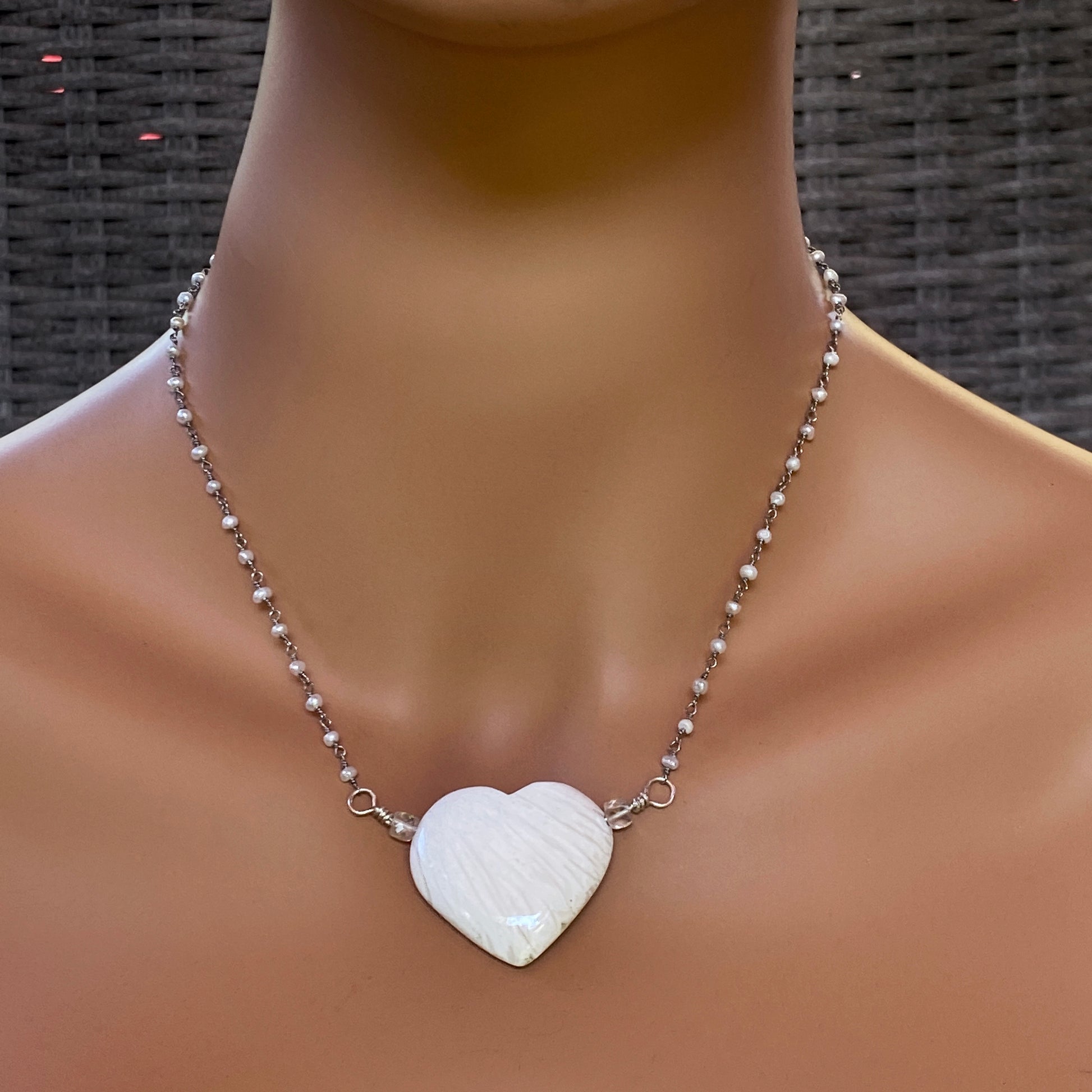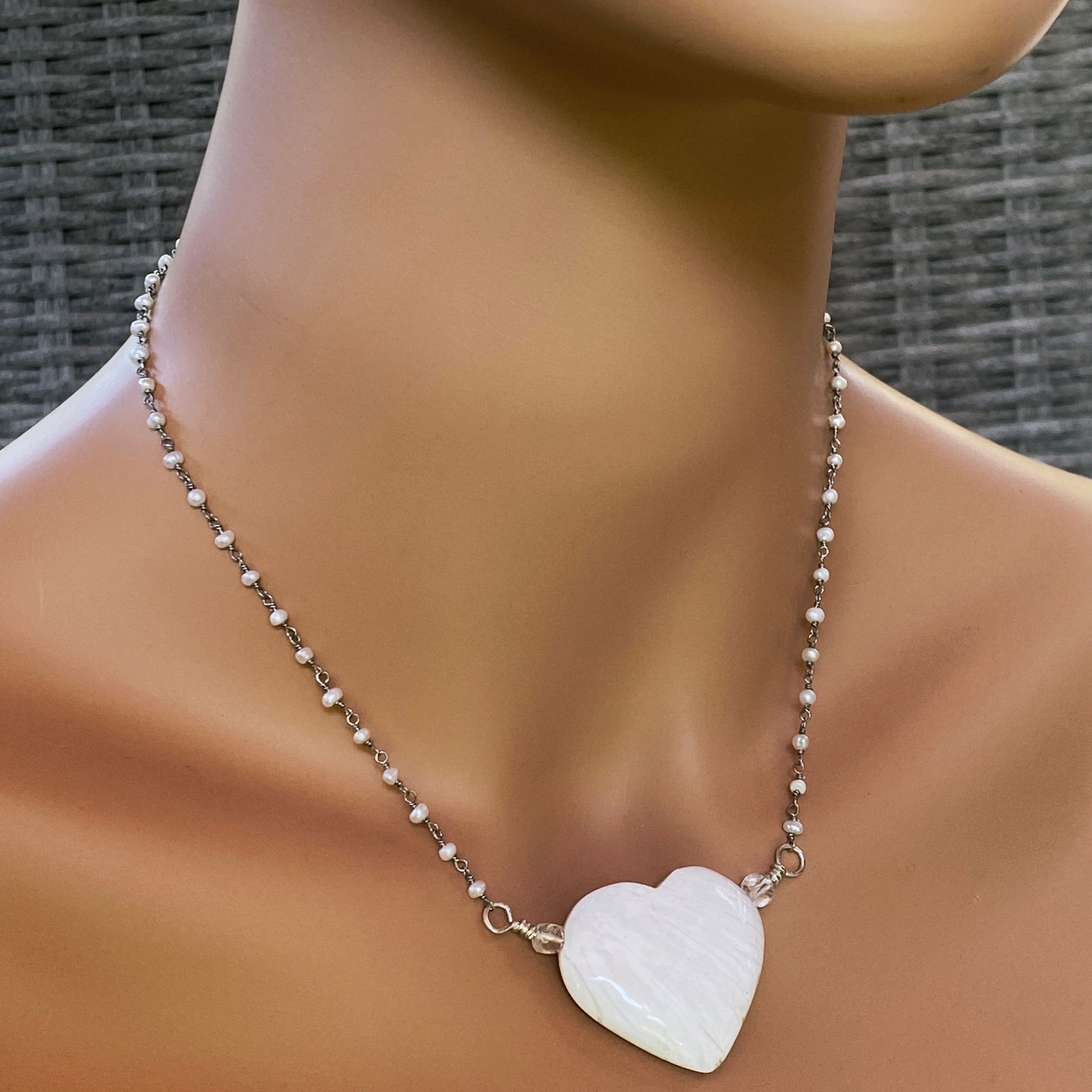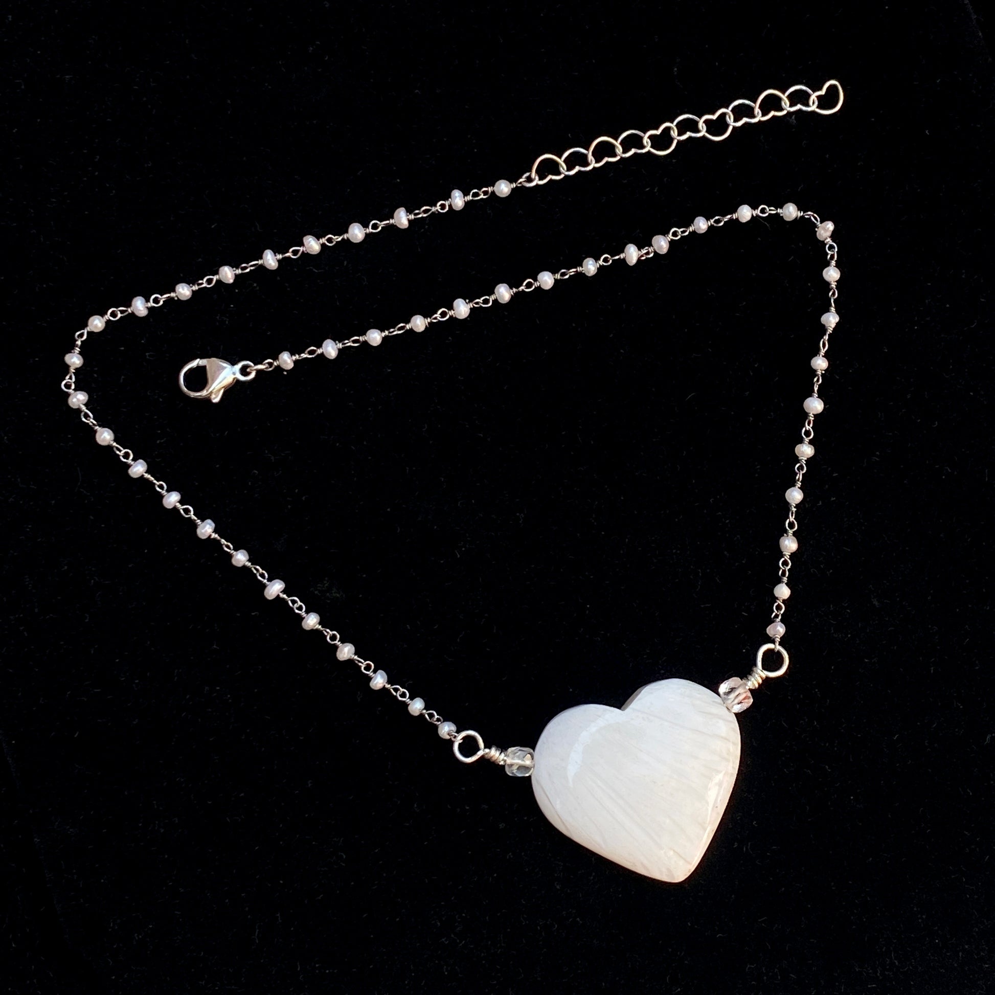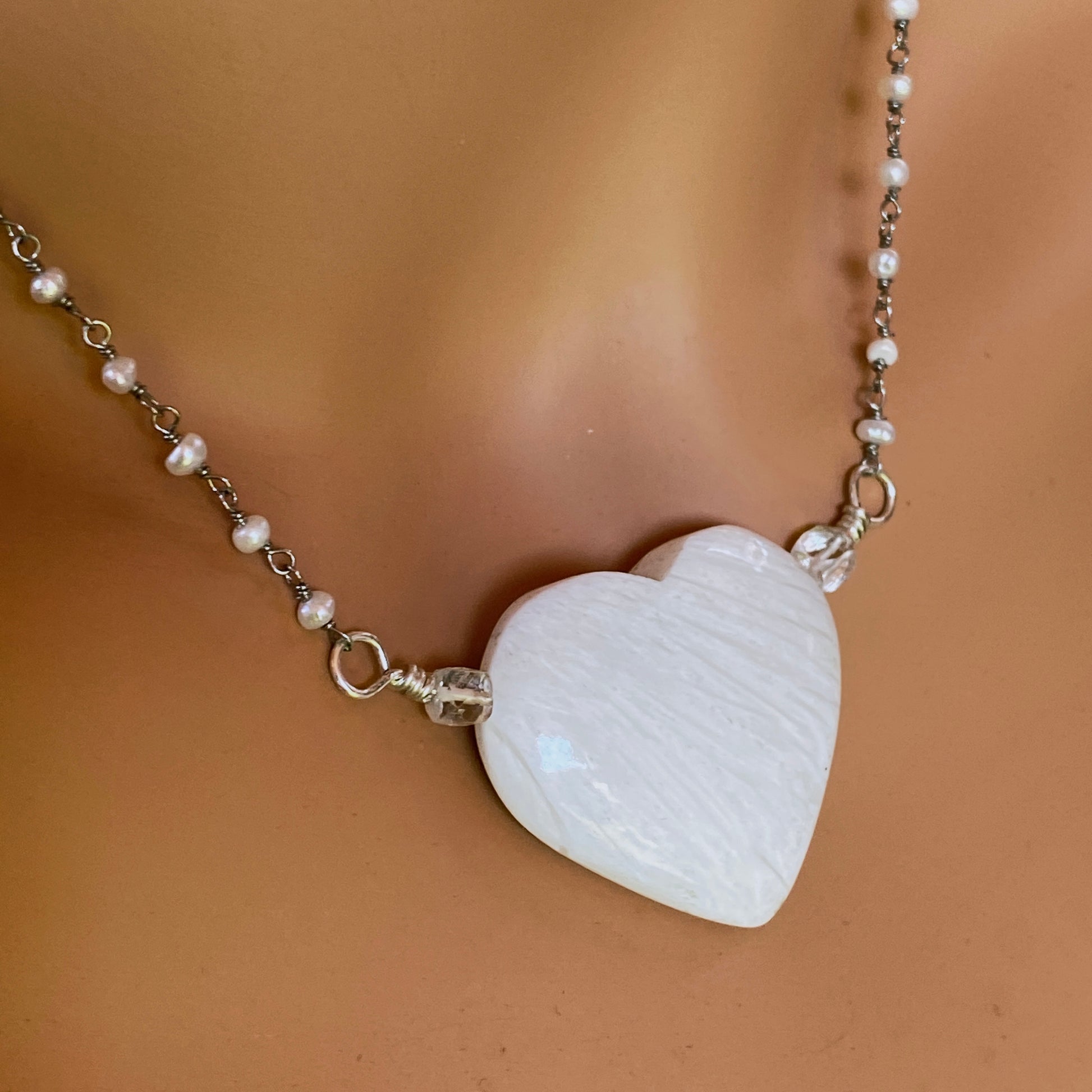 Scolecite gemstone Heart on Sterling Silver Wrapped Fresh Water Pearl Chain Necklace