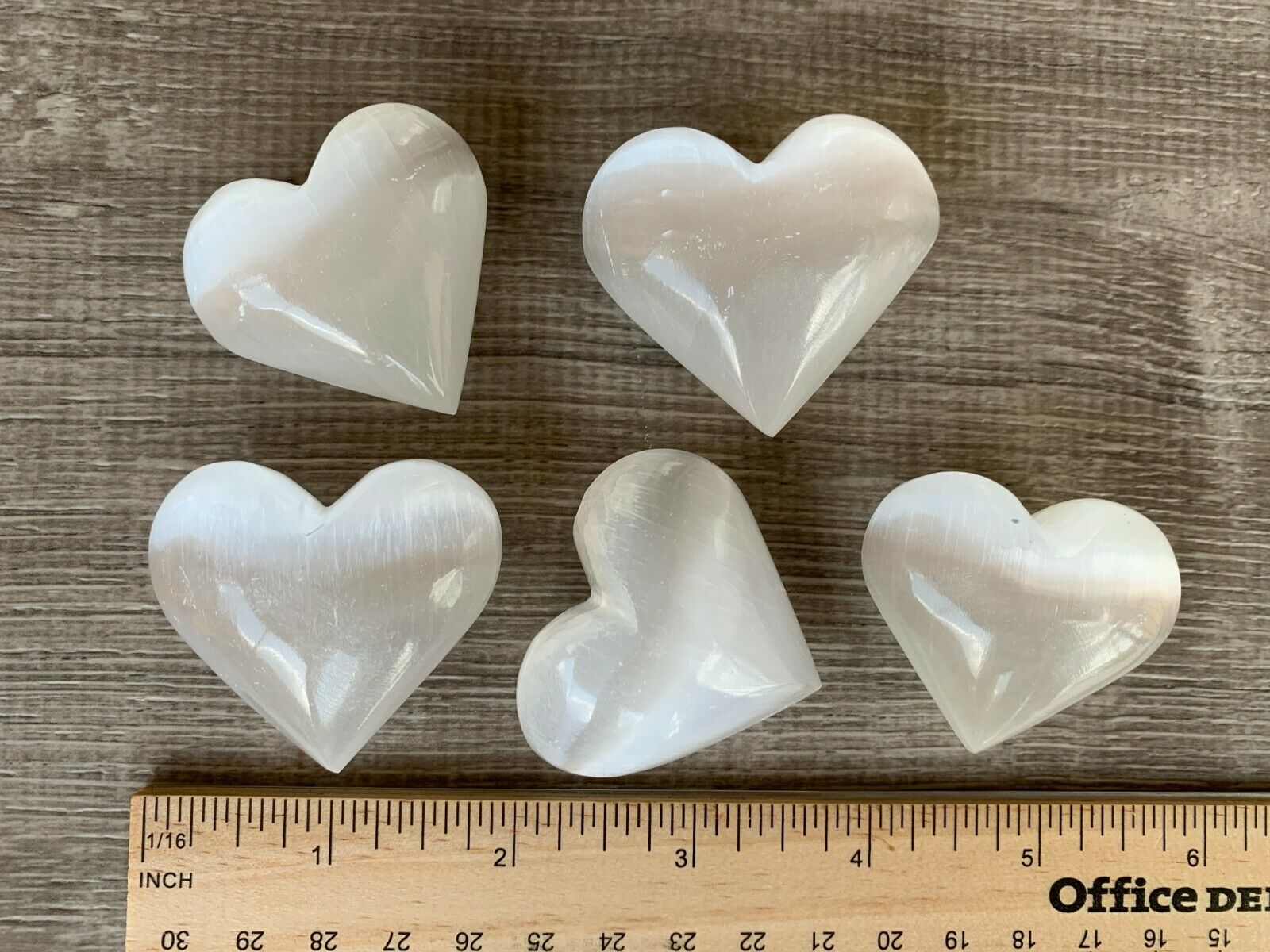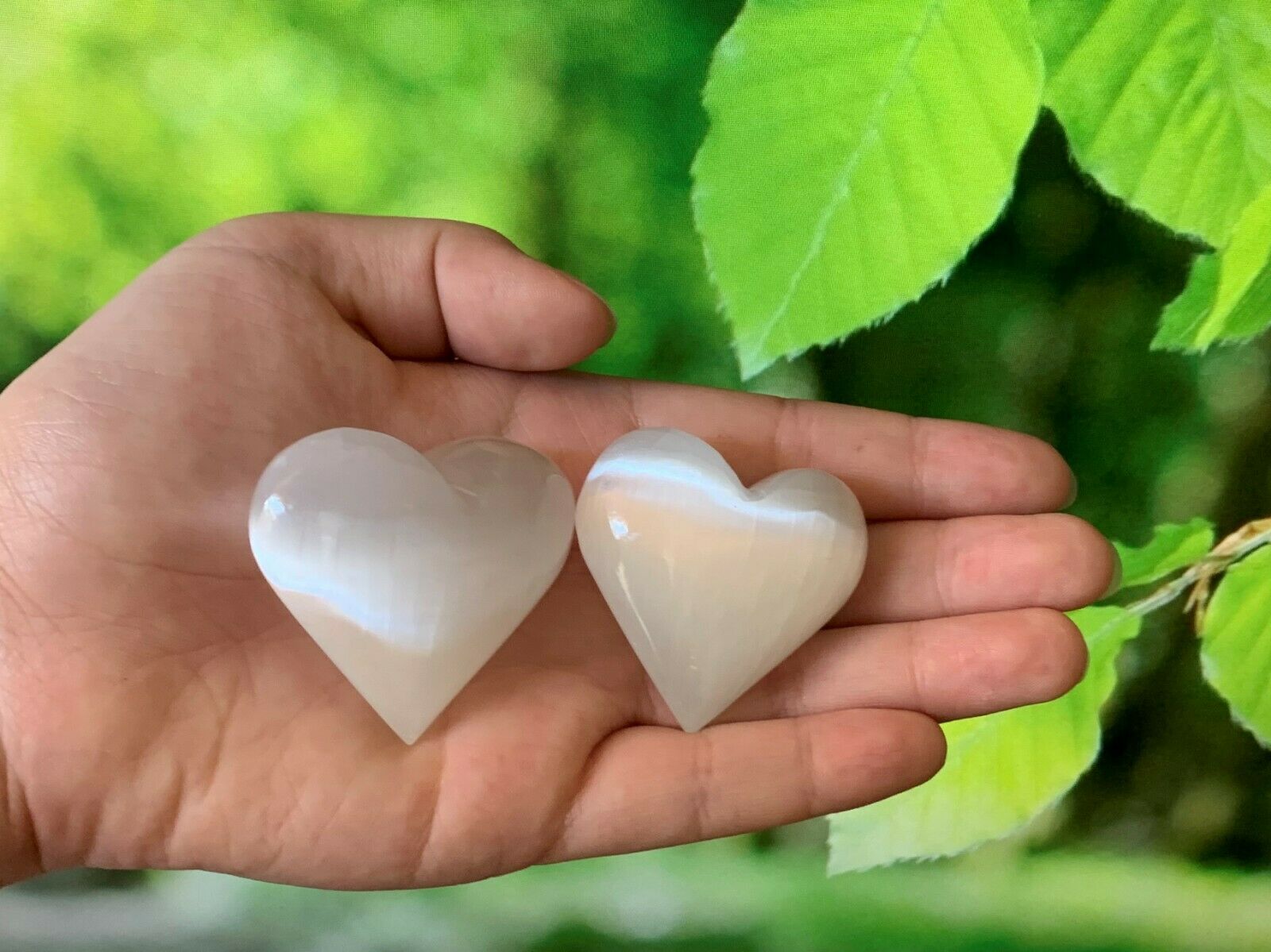 Hand-carved and hand-polished Selenite Hearts and sizes will vary.