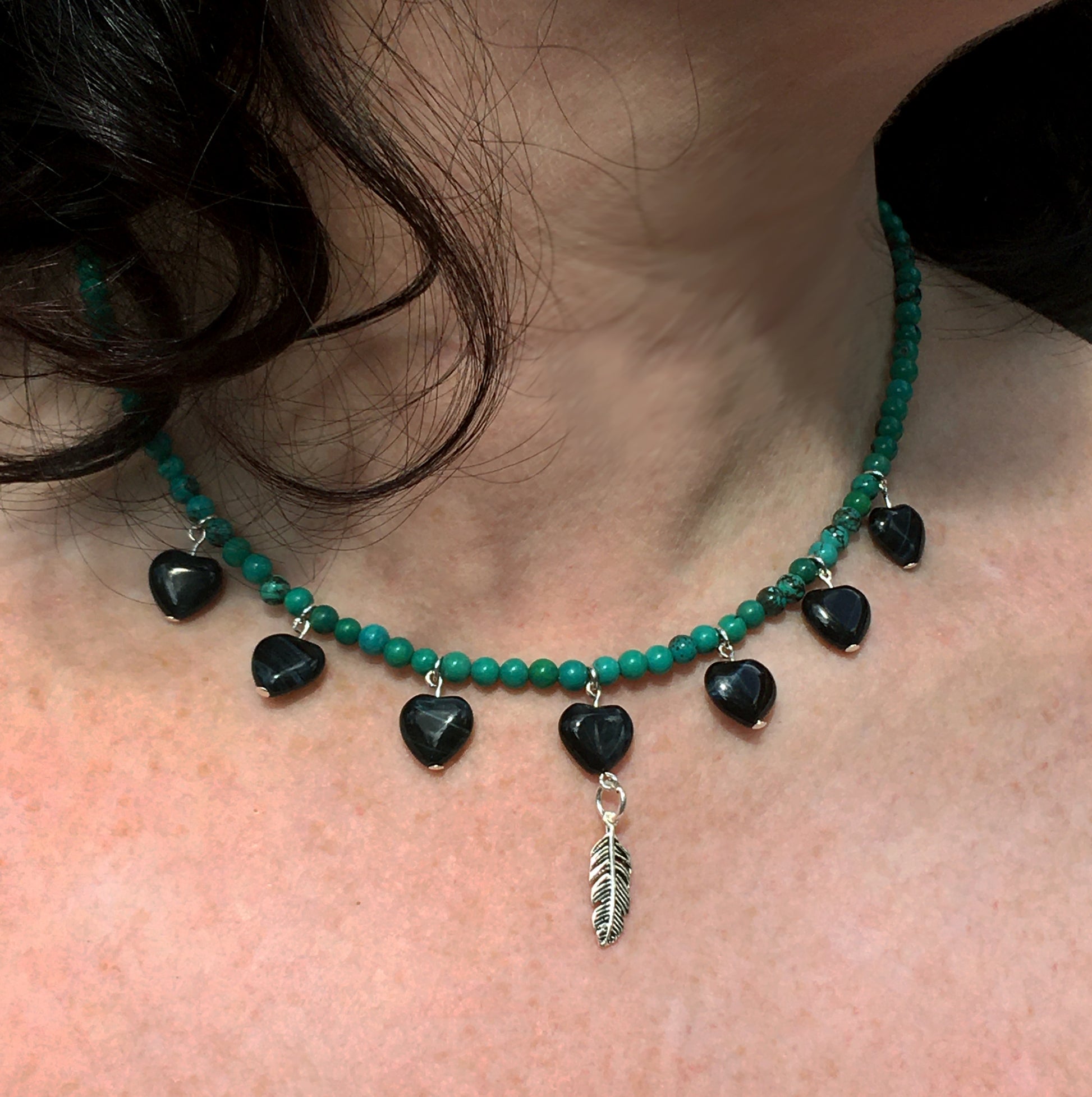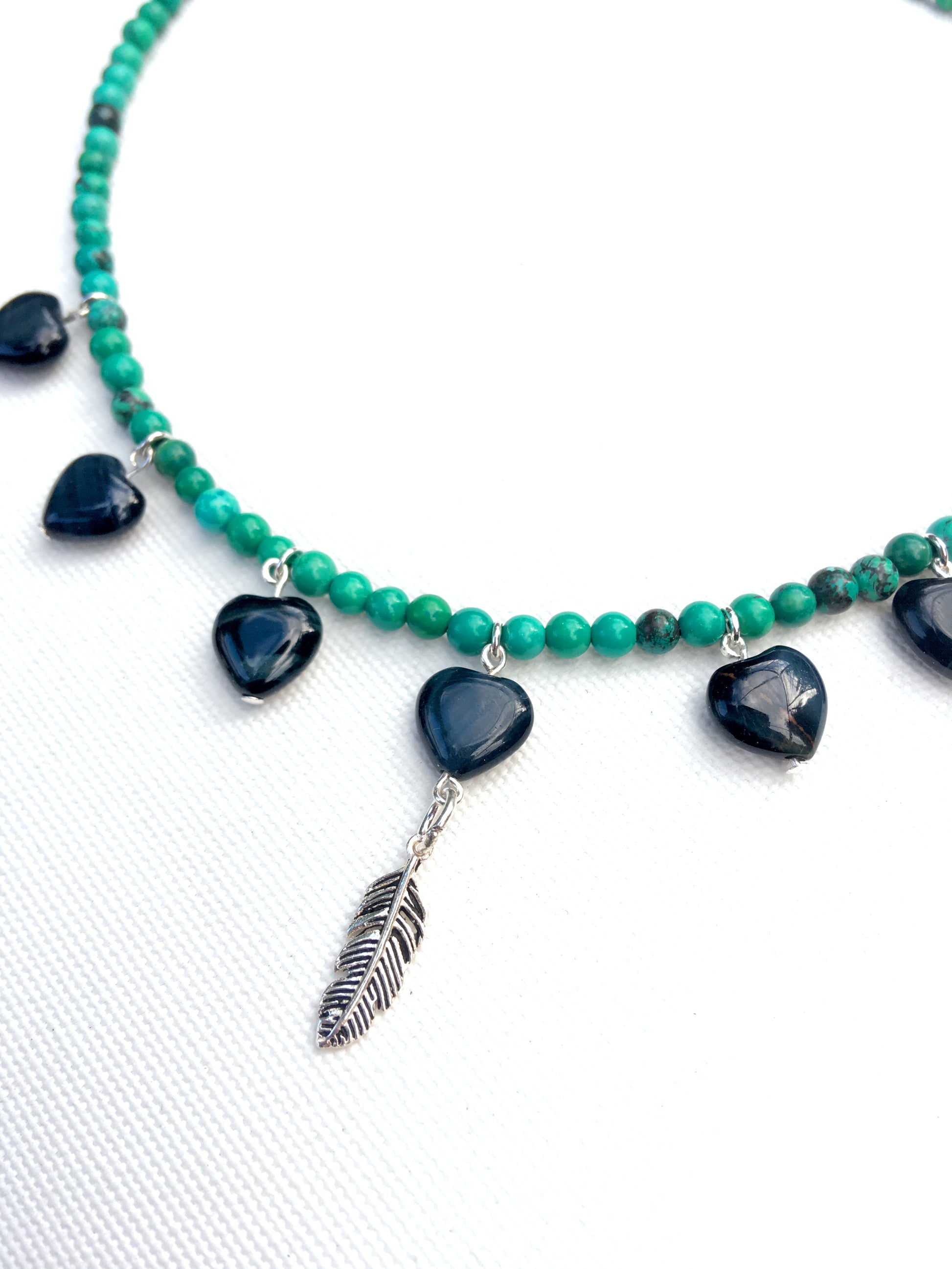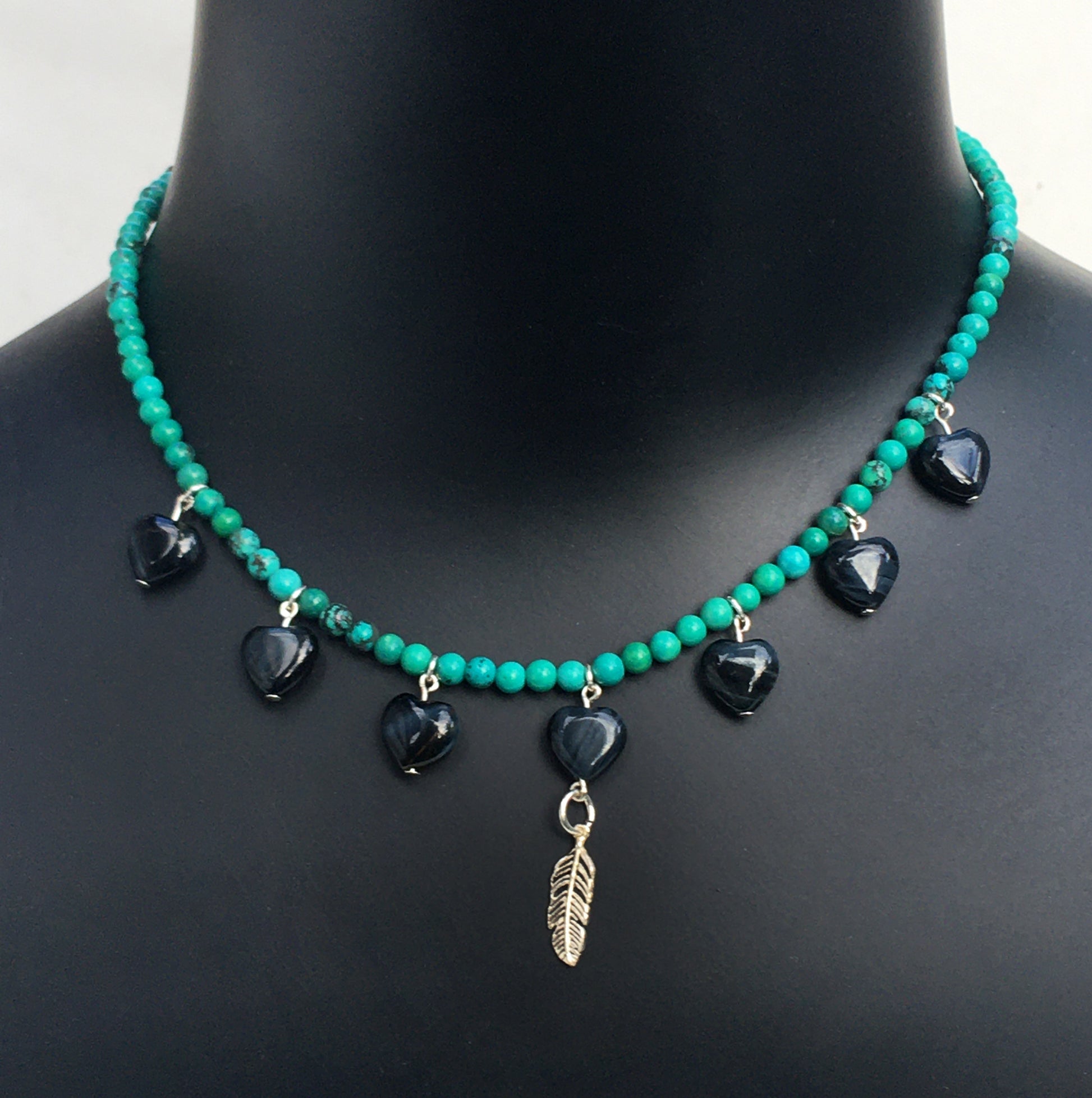 Women's Blue Tiger Eye heart Necklace with Turquoise with a Sterling Silver feather