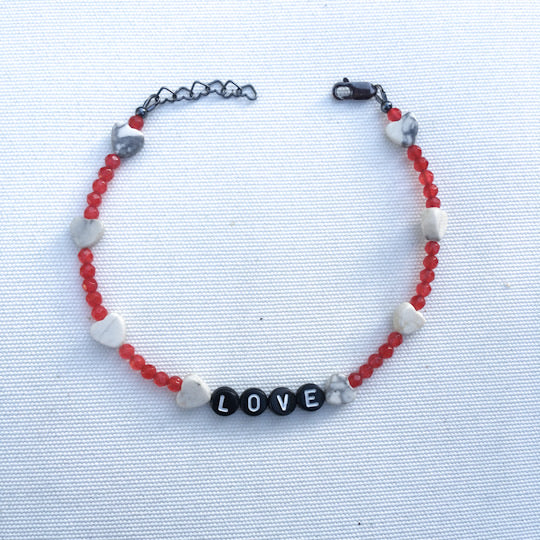 Women's "LOVE" Red Agate, White Turquoise Gemstone heart and oxidized Sterling Silver anklet